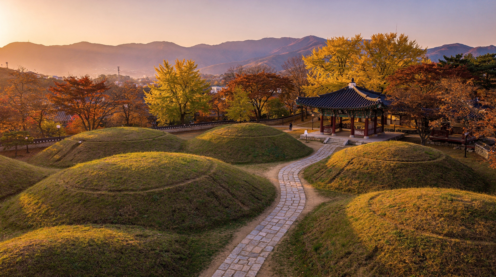 Gyeongju va ser la capital del Regne de Silla durant gairebé mil anys, i els fantasmes d'aquella època són a tot arreu — no d'una manera trista, sinó verda, ondulada i silenciosament espectacular. La ciutat s'asseu en una vall àmplia salpicada de túmuls reials: enormes monticles funeraris coberts d'herba que s'eleven en parcs públics i carrers residencials, tan naturals com turons però completament fets per mans humanes. Passejant entre ells a l'hora daurada, tens una sensació clara que el temps s'ha comprimit.